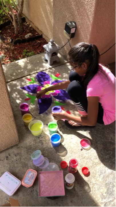 For me, Diwali is one of the most important and fun weeks in the year. To celebrate my daughter and I decorated the outside of our house with rangolis. Rangolis are patterns created on the floor or the ground using materials such as colored rice, dry flour, colored sand or flower petals that drawn near the entrance to the house with bright colors and designs. This symbolizes nature as well as signifies welcoming for guests.