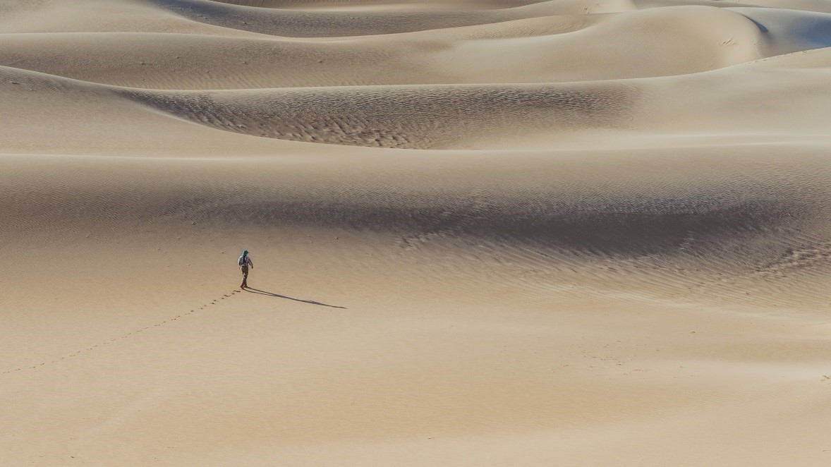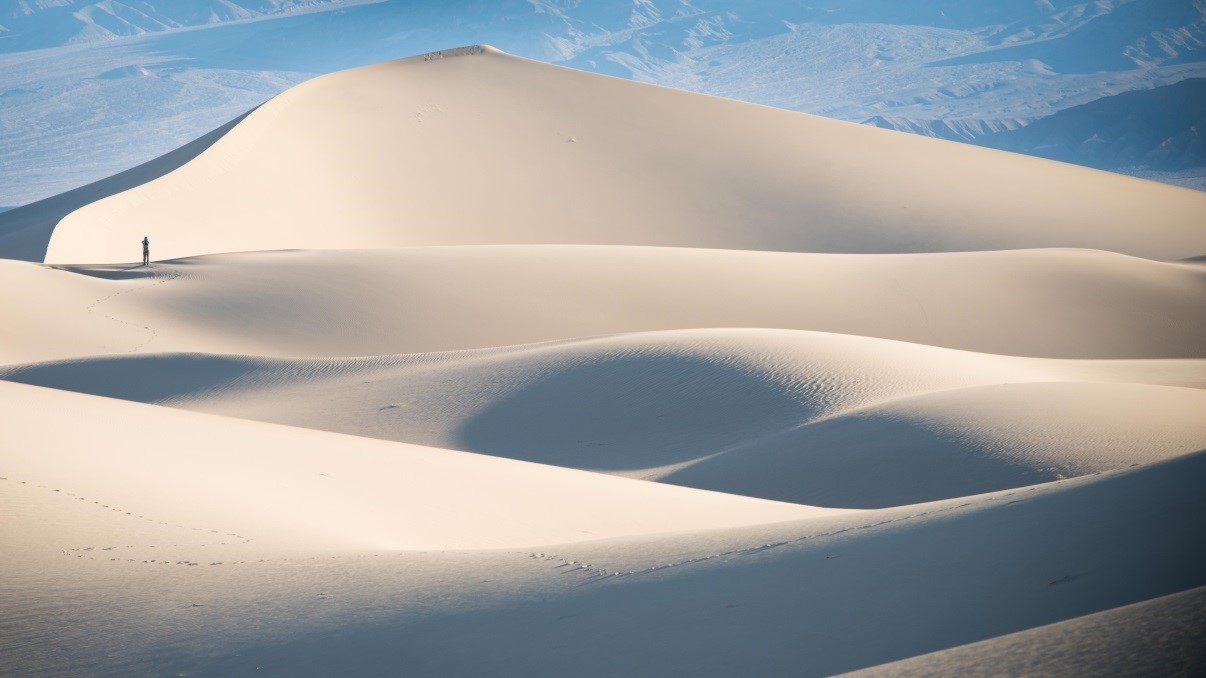 Of course, accountants and photographers are also very different. The most significant difference I want to point out is that mistakes are zero-tolerated for accountants but acceptable to photographers. When taking a picture, a photographer choose the wrong settings (e.g., exposure, focus, and aperture). Below is another picture I took in the desert of Death Valley, which was out of focus and using the wrong aperture. However, after replaying this, I think it is a meaningful capture (i.e., a solo adventurer walking in the vast desert with a shadow higher than himself, leaving a long line of footprints behind which would shortly disappear.)