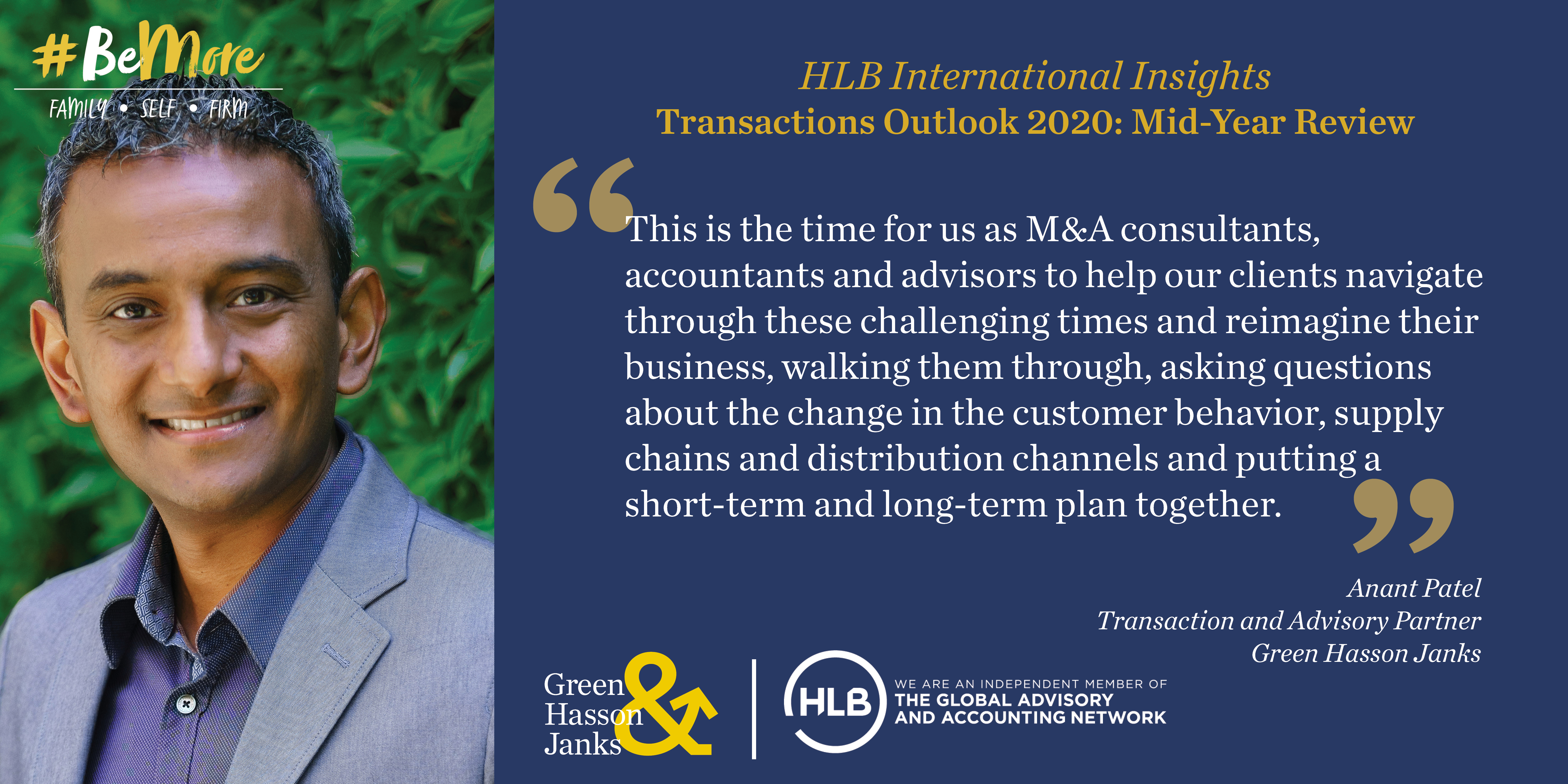 As highlighted by Anant Patel, HLB’s Global Transaction Advisory Services Leader, “This is the time for us as M&A consultants, accountants and advisors to help our clients navigate through these challenging times and reimagine their business, walking them through, asking questions about the change in the customer behaviour, supply chains and distribution channels and putting a short term and long term plan together.”