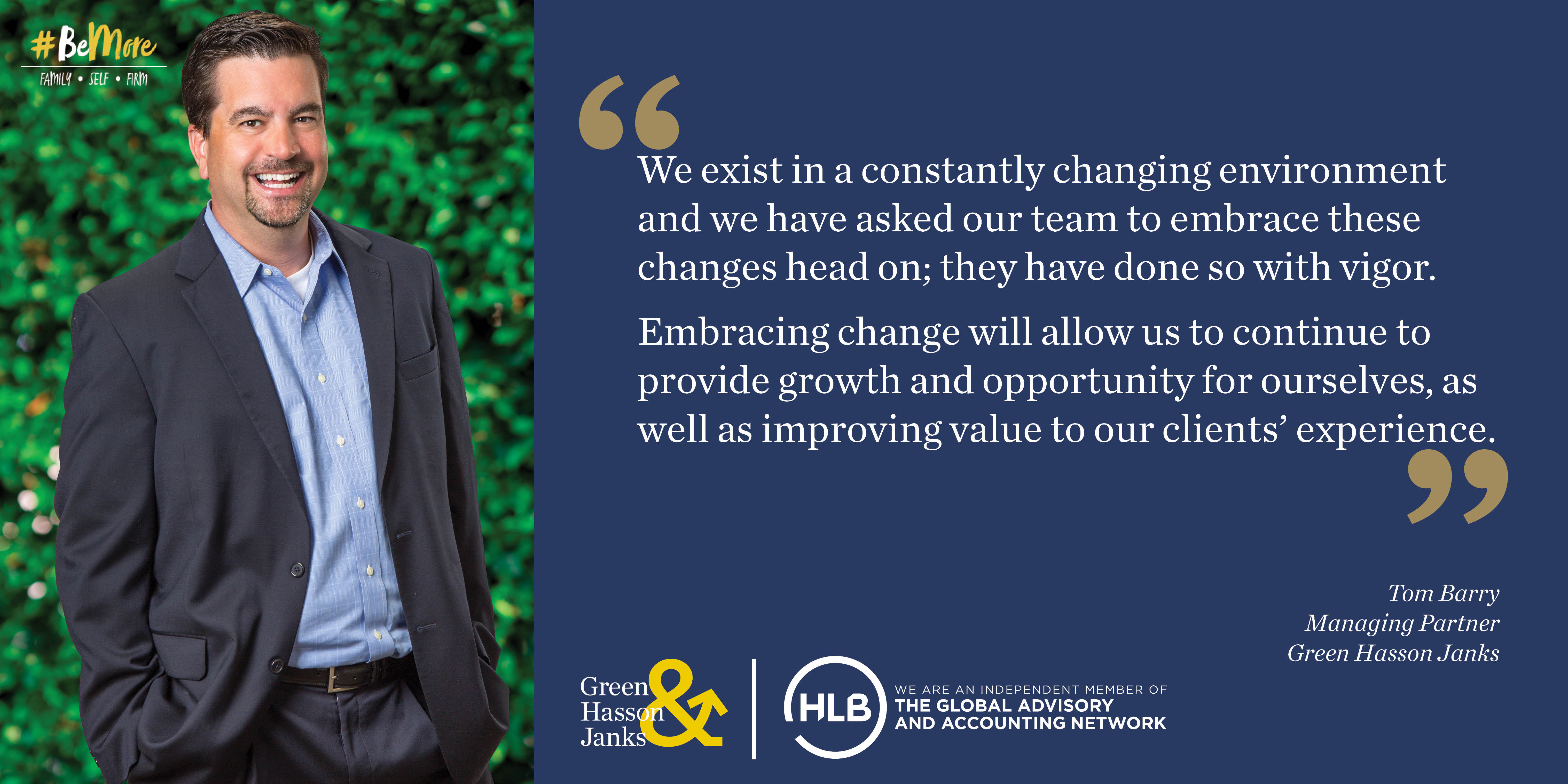 In Barry’s #BeMore vision, he recognized that individual goals, whether personal or professional, have the greatest opportunity for success if employees can #BeMore to themselves, their family and the firm. These three tenets of the #BeMore philosophy are how GHJ is building a Next Generation firm under Barry’s guidance.
