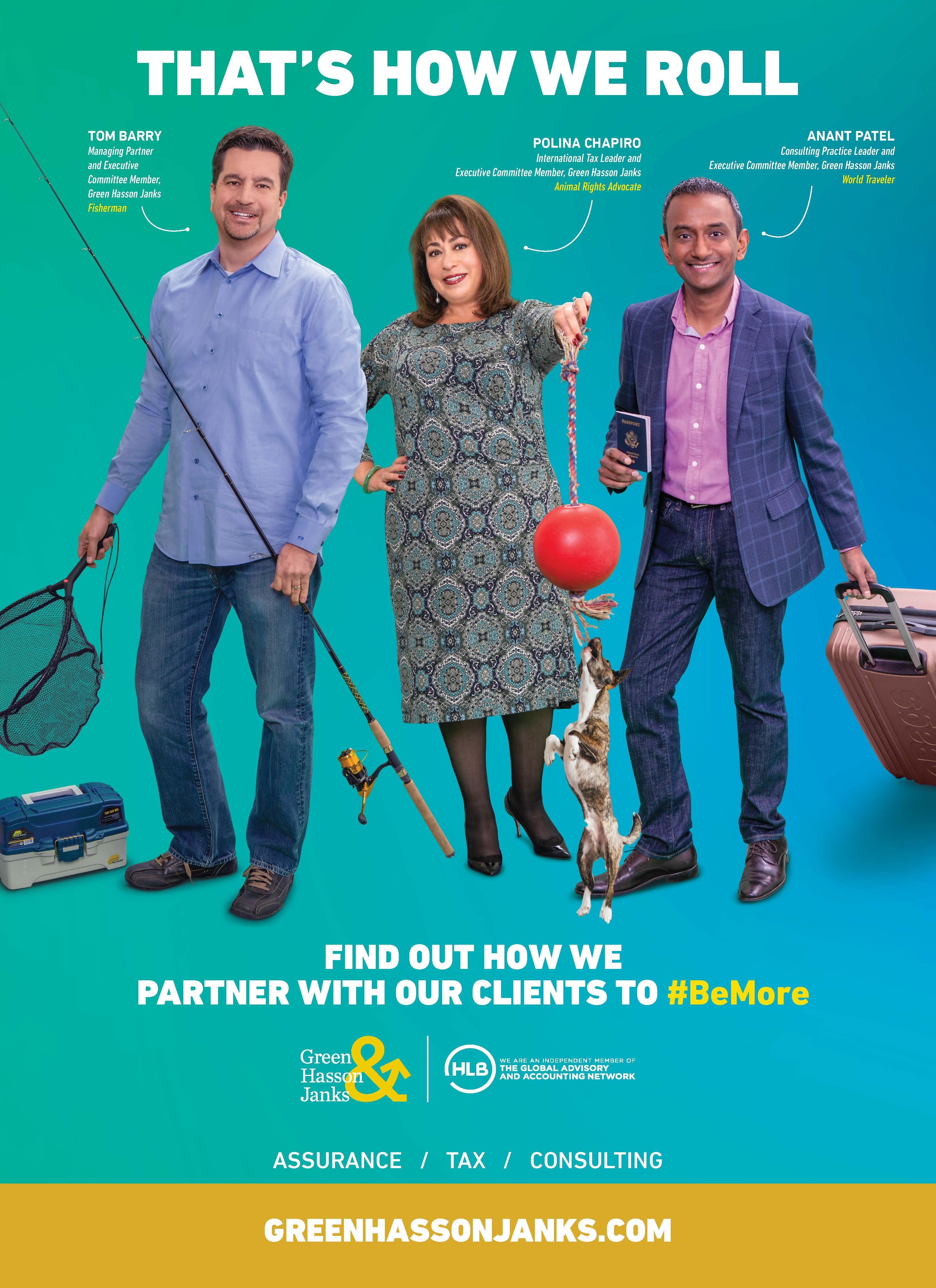 GHJ’s 2019 ad campaign kicked off off in the Feb. 11, 2019 issue of Los Angeles Business Journal. GHJ’s Tom Barry, Polina Chapiro, Anant Patel, Anita Wu, Akash Sehgal and Donella Wilson illustrate how working at GHJ allows them to #BeMore than just accountants in our new “That’s How We Roll” ad campaign. Throughout the year GHJ's leaders Ben Sheppard, David Sutton, Mari-Anne Kehler, Francesco Catullo, Frances Ellington, David Horwich, Derrick Coleman, Andrew Holoubek and Lizbeth Nevarez have been featured.